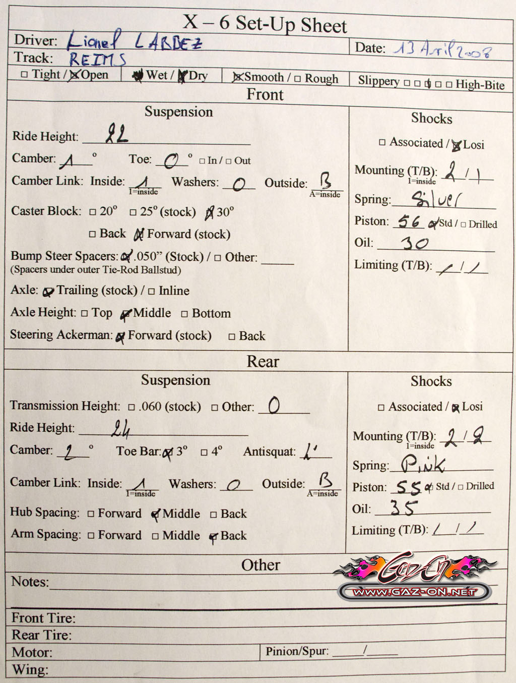 4x2- Setup Sheet de Raphaë l Gayoso sur X-Factory X-6 | date: 17/02/2008