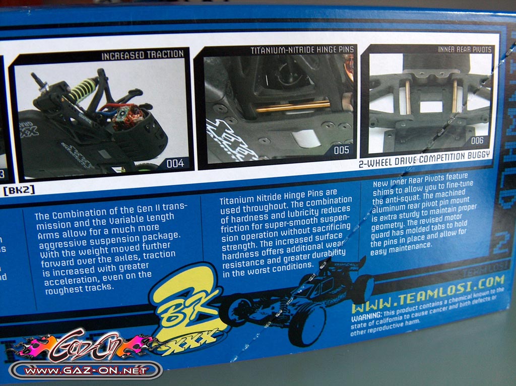 Le XXX BK2 est la troisième version apparue en 2003 du célèbre châssis 2 roues motrices Tout Terrain 1/10 électrique de la marque américaine Team Losi.L’appelation "BK2" provient du nom du top pilote de la marque Brian Kinwald, Champion du Monde aux commandes de ce châssis ; et 2 comme 2nde version, la 1ère version du BK (également Champion du Monde) étant sortie quelques années auparavant.