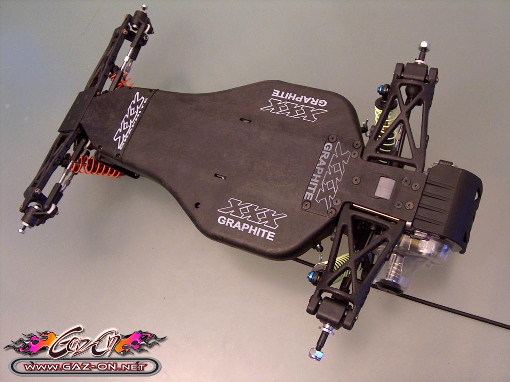 La matière du châssis est différente du XXX BK1 et le rend plus rigide, ce qui est un plus sur les pistes propres mais pénalisant sur les pistes défoncées car le châssis ne tient plus son rôle de filtre !