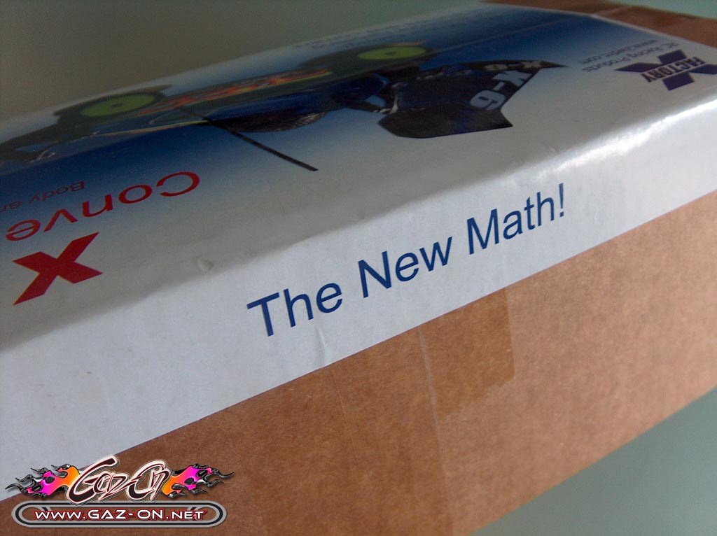 Le kit de conversion du X-6 est livré dans une simple boite cartonnée avec pour seule décoration, une impression A4 couleur d’une photo du X-6 autour de laquelle on trouve les infos principales sur le contenu de la boite (kit de conversion, carrosserie et aileron de chez J-Concepts, axe Lunsford) et deux petites notes de marketing :- le moteur en position centrale arrière permettrait une meilleure prise en main, stabilité, et efficacité dans les sauts et dans les virages (ce que nous vérifierons).