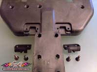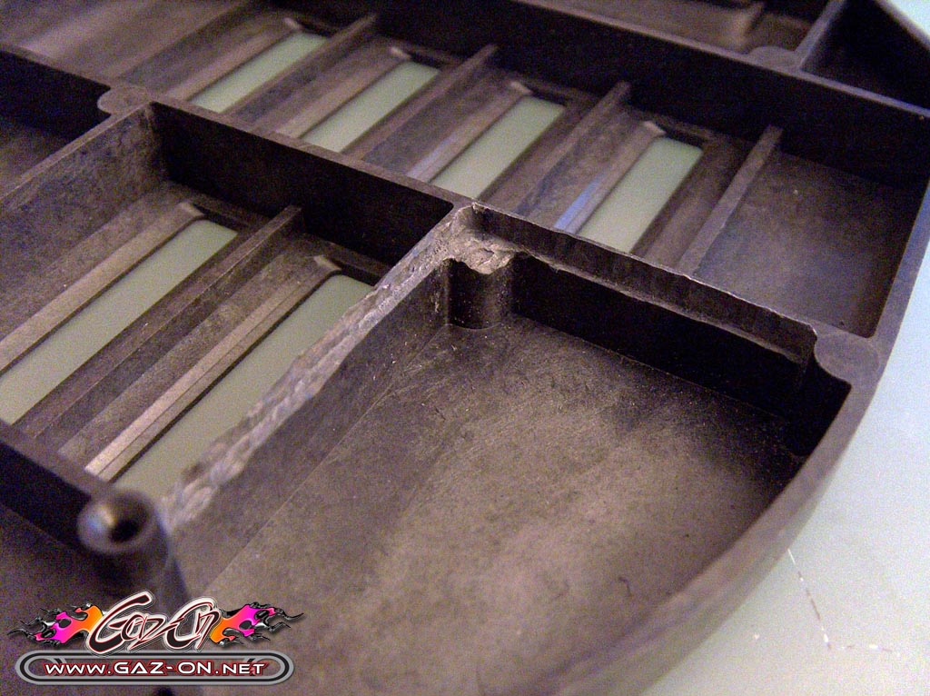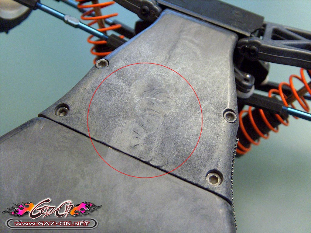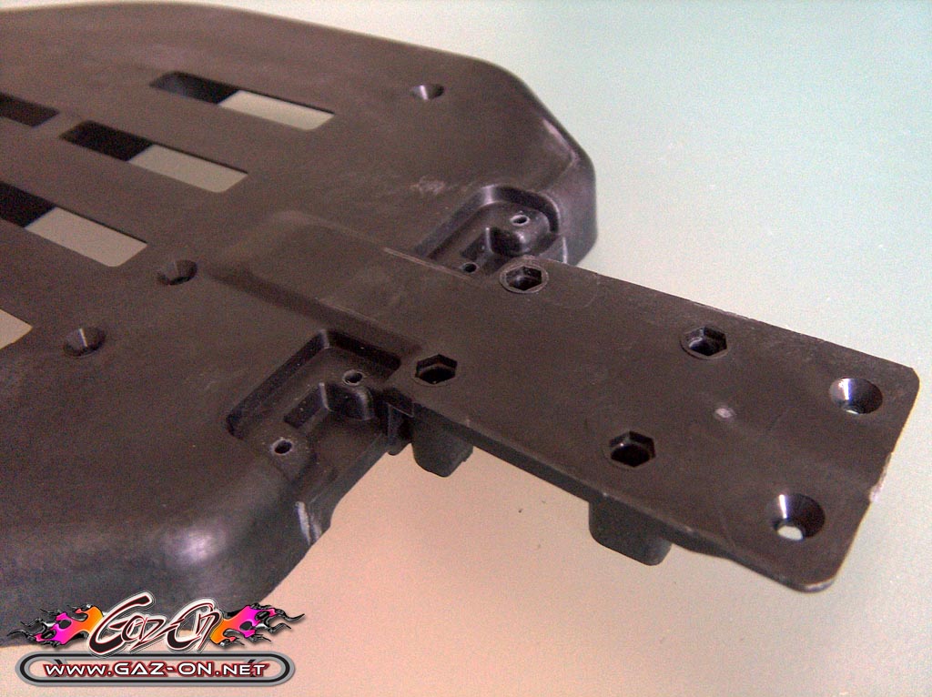 Malgré tout, X-Factory a affublé l’envers du châssis du X-6 d’une surépaisseur de graphite entre la partie centrale et la partie arrière du châssis pour assurer le lien dans le but de rigidifier et de fiabiliser cette liaison.