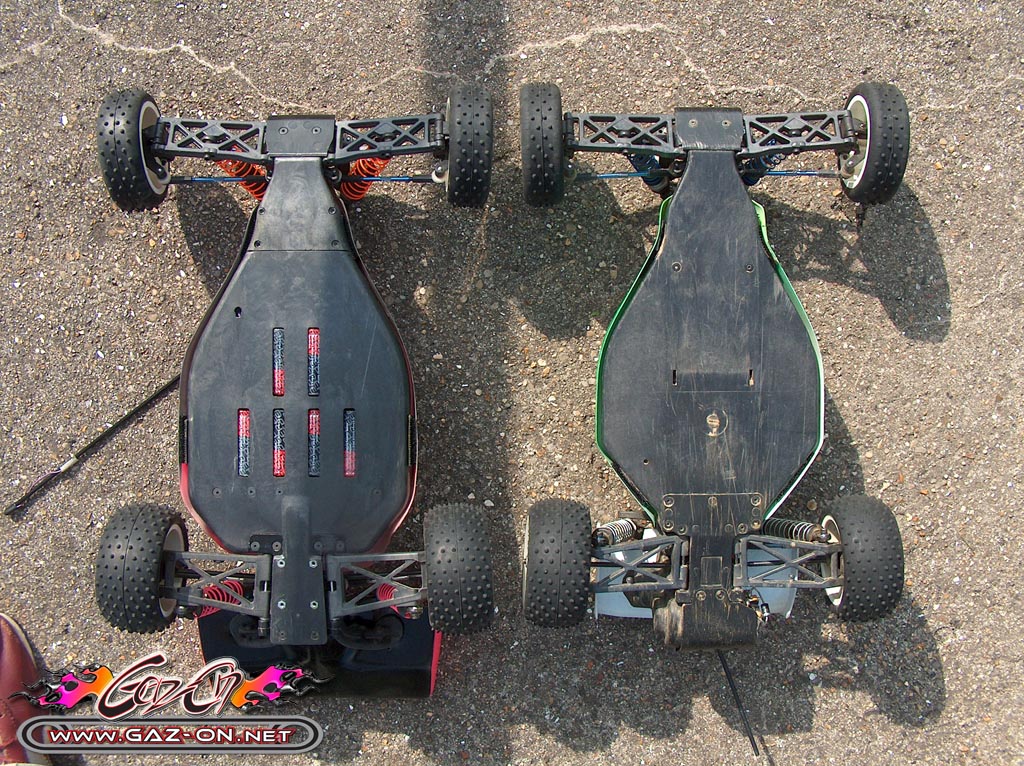 Il nous a paru intéressant de comparer de ses deux « faux jumeaux », ce qui nous a été possible lors de nos séances d’essais où nous avons fait évoluer notre X-6 avec les setups de Valente face à un Associated B4 FT avec un setup très proche de celui de Neil Cragg lors du Championnat d’Europe 2005.Sur les photos, on constate immédiatement que la partie avant des 2 autos est similaire, mêmes pièces, mêmes angles, même voie, etc…